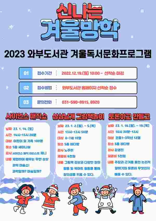 남양주시 와부도서관 관계자는 “이번 프로그램을 통해 겨울방학을 맞은 어린이들이 유익한 지식과 정보를 배울 뿐만 아니라 가족과 즐거운 시간을 보내면서 책과 더 친해질 수 있는 계기가 되길 바란다”고 밝혔다.