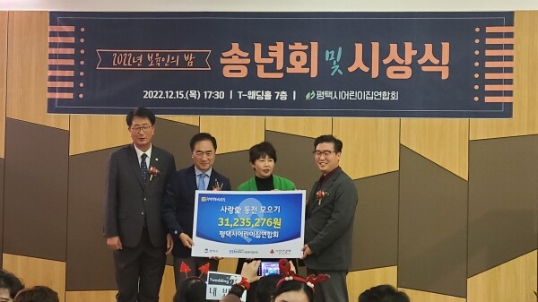 이번 송년회에서는 우수 보육 교직원에 대한 평택시장 및 경기도지사 표창 전수와 연합회 공모전 입상자 시상식을 진행했으며 특히 한 해 동안 어린이집과 각 가정에서 어린이들이 동전을 모아 마련한 3,123만원을 기부해 더욱 풍성한 자리가 됐다.