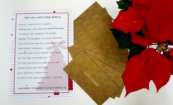 주민단체는 학생들이 원하는 학용품 및 책가방 등을 구매할 수 있도록 상품권을 인당 10만원씩 지급하고 입학 축하편지도 함께 전했다.