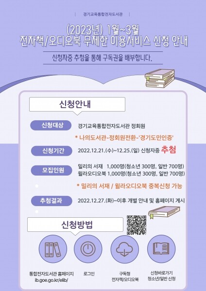 이 서비스는 경기도민에게 ‘밀리의 서재’와 ‘윌라오디오북’의 다양한 독서콘텐츠를 무료로 제공하는 것으로 이용 기간은 2023년 1월 1일부터 3월 31일까지다.