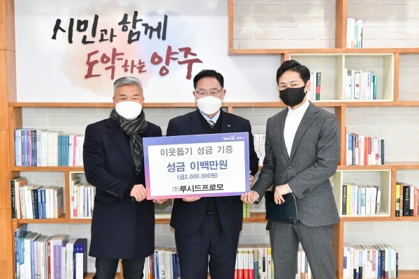 이날 전달식에는 강수현 양주시장, ㈜루시드프로모 김병수 대표 및 직원들이 참석했으며 이번 성금은 관내 취약계층에 전달될 예정이다.