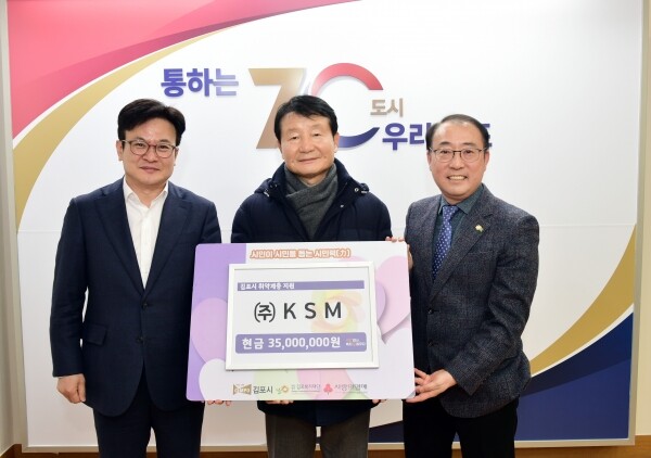 이날 기탁식에는 ㈜KSM 김윤호 대표와 김병수 김포시장, 김포복지재단 이병우 대표이사 등이 참석해 전달식을 진행했다.