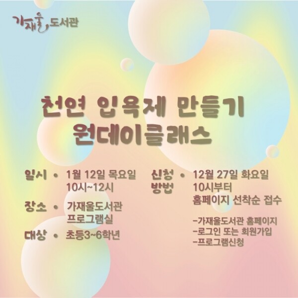 “친환경 배스볼 만들기 원데이클래스”는 1월 사서컬렉션인 “몸도 마음도 건강하게”에 맞는 피부 건강과 위생을 위한 원데이클래스로 천연재료인 베이킹소다, 옥수수전분 등을 사용한 반죽에 천연 색소와 모양틀을 이용해 거품이 풍성한 입욕제를 만들어 볼 수 있다.