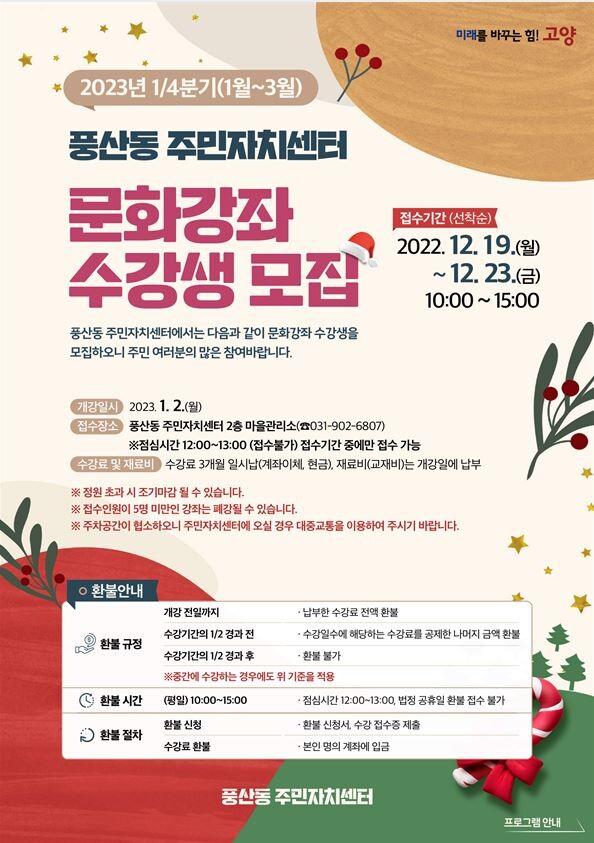 풍산동 주민자치센터 문화강좌 프로그램 접수는 12월 19일부터 12월 23일까지 매일 오전 10시부터 오후 3시까지 풍산동 주민 자치센터 2층 마을관리소에서 진행되며 자세한 내용은 고양시청 홈페이지 내 풍산동 페이지에서 확인 가능하다.