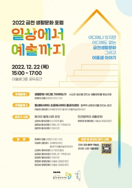 오진이 금천문화재단 대표이사는 “연말을 맞아 주민과 재단이 함께 지역의 생활문화 방향을 찾고 이야기도 나누는 자리를 만들었다”며 “포럼 내용을 참고해 주민의 일상에서 생활문화가 더욱 활성화될 수 있는 토대를 마련할 것”이라고 전했다.