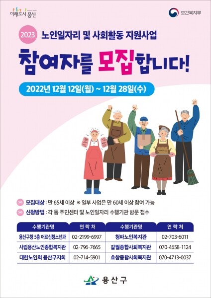 모집 대상은 용산구에 거주하는 만 65세 이상 신체활동 가능한 어르신 중 기초연금 수급자이며 사업에 따라 만 60세 이상 기초연금 미수급자도 참여 가능하다.