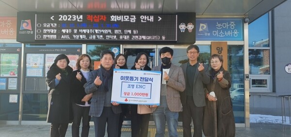 이날 성금 기탁을 위해 양성면사무소를 방문한 ㈜조영이앤씨 관계자는 “연말연시를 맞이해, 겨울철 한파에 더 위축되어 있을 불우이웃에게 조금이라도 도움을 드리고 싶은 마음에 성금 기탁을 결정했다”고 전했다.