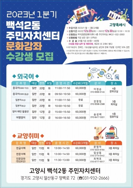 백석2동 주민자치센터 문화강좌 프로그램 수강신청은 선착순 모집으로 백석2동 행정복지센터 4층 주민자치실을 방문해 신청하면 된다.