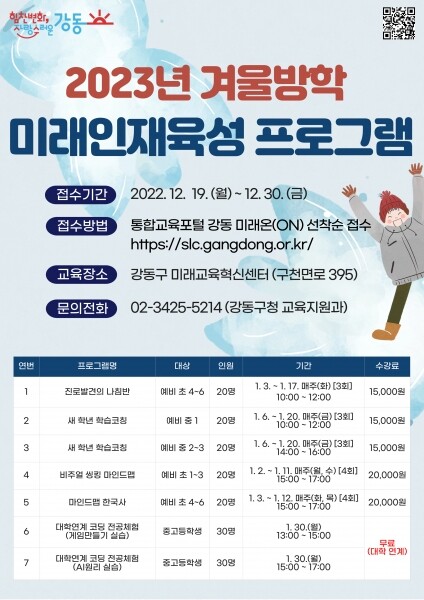 프로그램 신청은 오는 12월 30일까지 통합교육포털 강동 미래온에서 회원가입 후 신청 가능하며 기타 궁금한 사항은 강동구청 교육지원과로 전화하면 자세히 안내 받을 수 있다.
