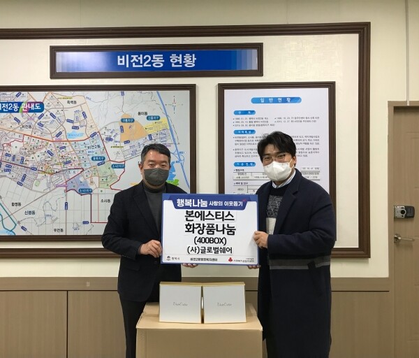 [뉴스서울] 글로벌쉐어는 지난 21일 복지사각지대의 소외이웃을 위해 화장품 400세트를 평택시 비전2동 행정복지센터에 기부하는 뜻깊은 시간을 가졌다.