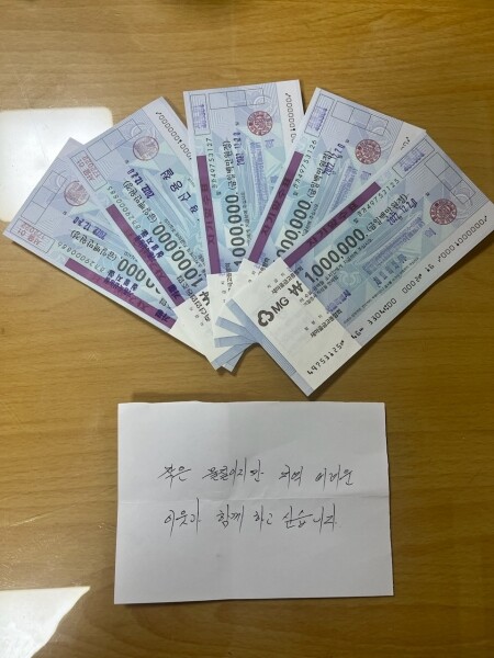 익명의 방문자가 건낸 봉투에는 “작은 물질이지만 지역 어려운 이웃과 함께 하고 싶습니다”고 쓰여진 편지와 일백만원권 수표 5장이 들어있었다.