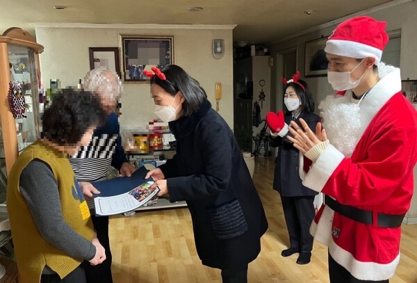 이에 치매안심센터 관계자들은 수료식과 송년모임이 취소된 것을 아쉬워하는 쉼터 참여자와 가족을 위해 치매안심센터장과 직원들이 산타복장을 하고 센터에서 만든 크리스마스 케이크와 수료증 등을 30여명의 어르신 댁에 방문해 전달했다.