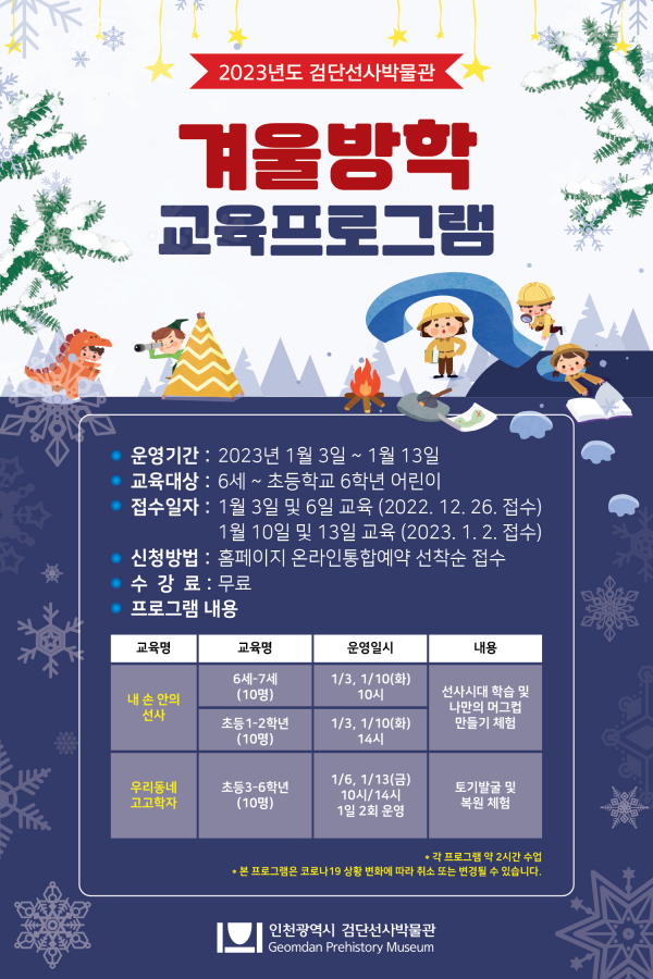 이번 교육프로그램은 내년 1월 3일부터 13일까지 매주 화요일에는 ‘내 손안의 선사’가 금요일에는‘우리동네 고고학자’가 진행되며 오전 10시와 오후 2시 하루 2회 운영된다.